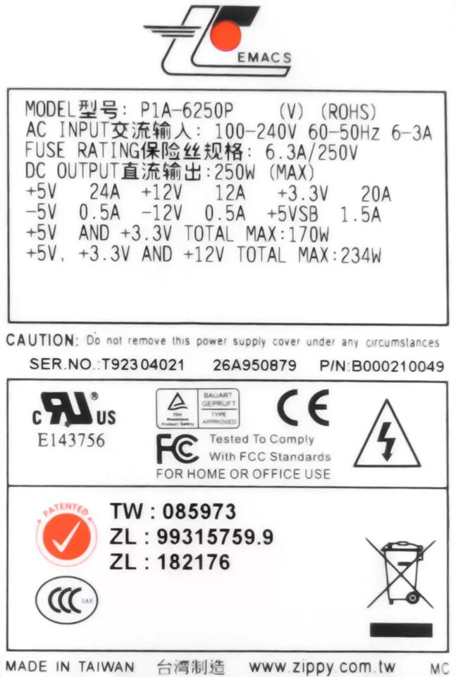 1pc Zippy P1A-6250P 1U 250W IPC Firewall Server Power Supply