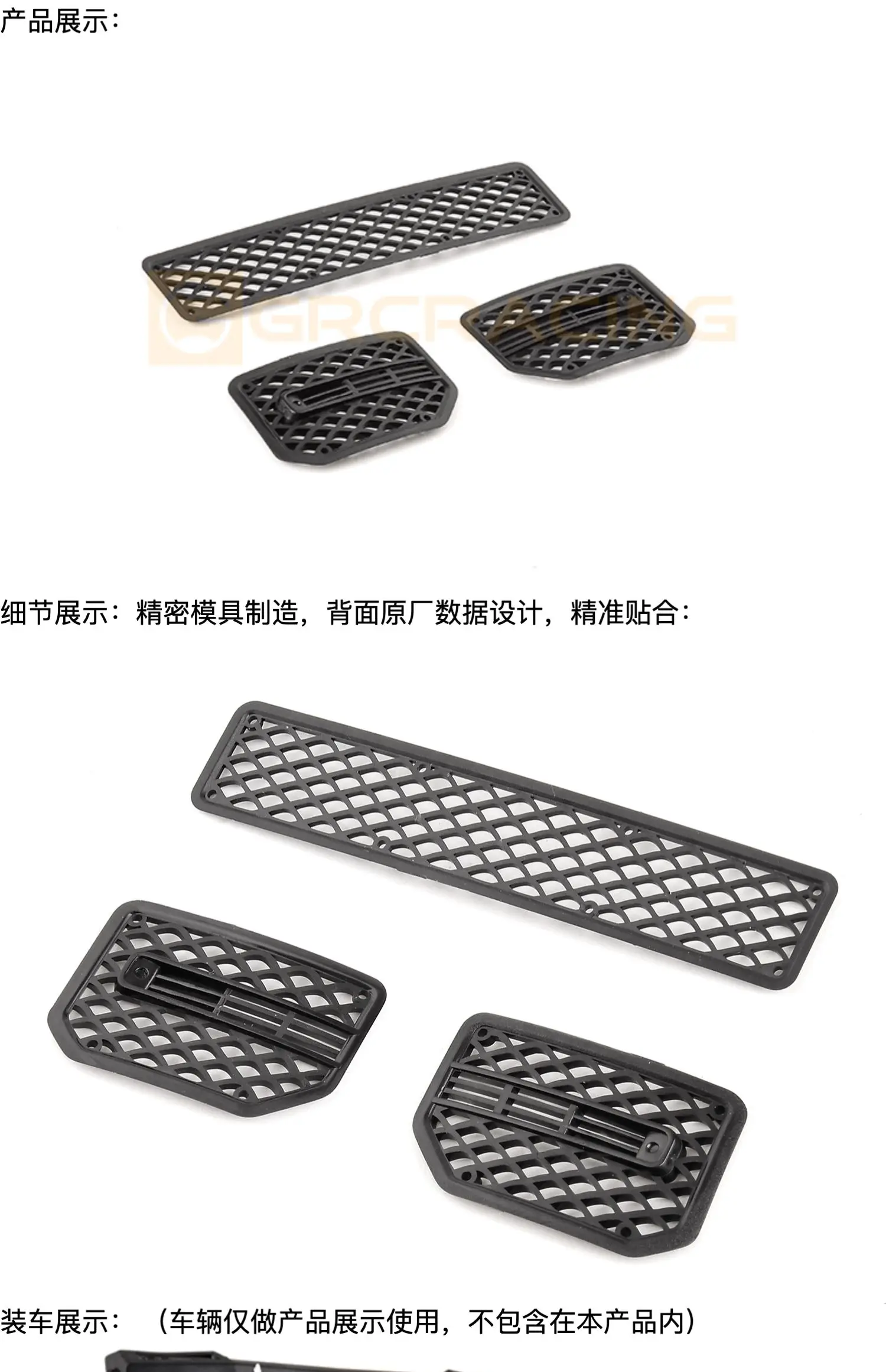 Product features: The grille decoration adopts a mold manufacturing process, replicating real car fish scale like mesh holes. The material is strong, delicate, and simulated.