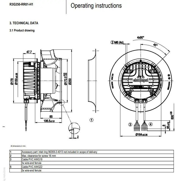 R3G250-RR01-H1 Centrifugal Fan 230VAC 500W 250MM 2.2A EC Cooling Fan