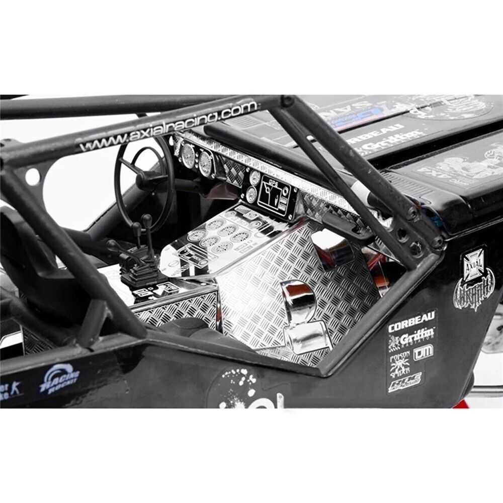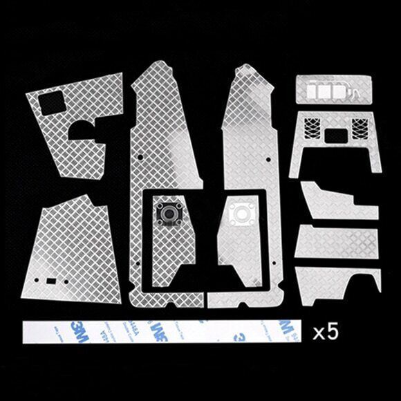 The product is made of stainless steel, which is made according to the details of the real car. The instrument panel light is hollowed out and the steering light is hollowed out and other details, which is convenient for the player to post the DIY lighting instrument panel. The original switch, gear handle and steering wheel mounting hole have been reserved. Rear luggage nets, speakers, fire extinguishers and other details are included in the interior floor skid plate kit.